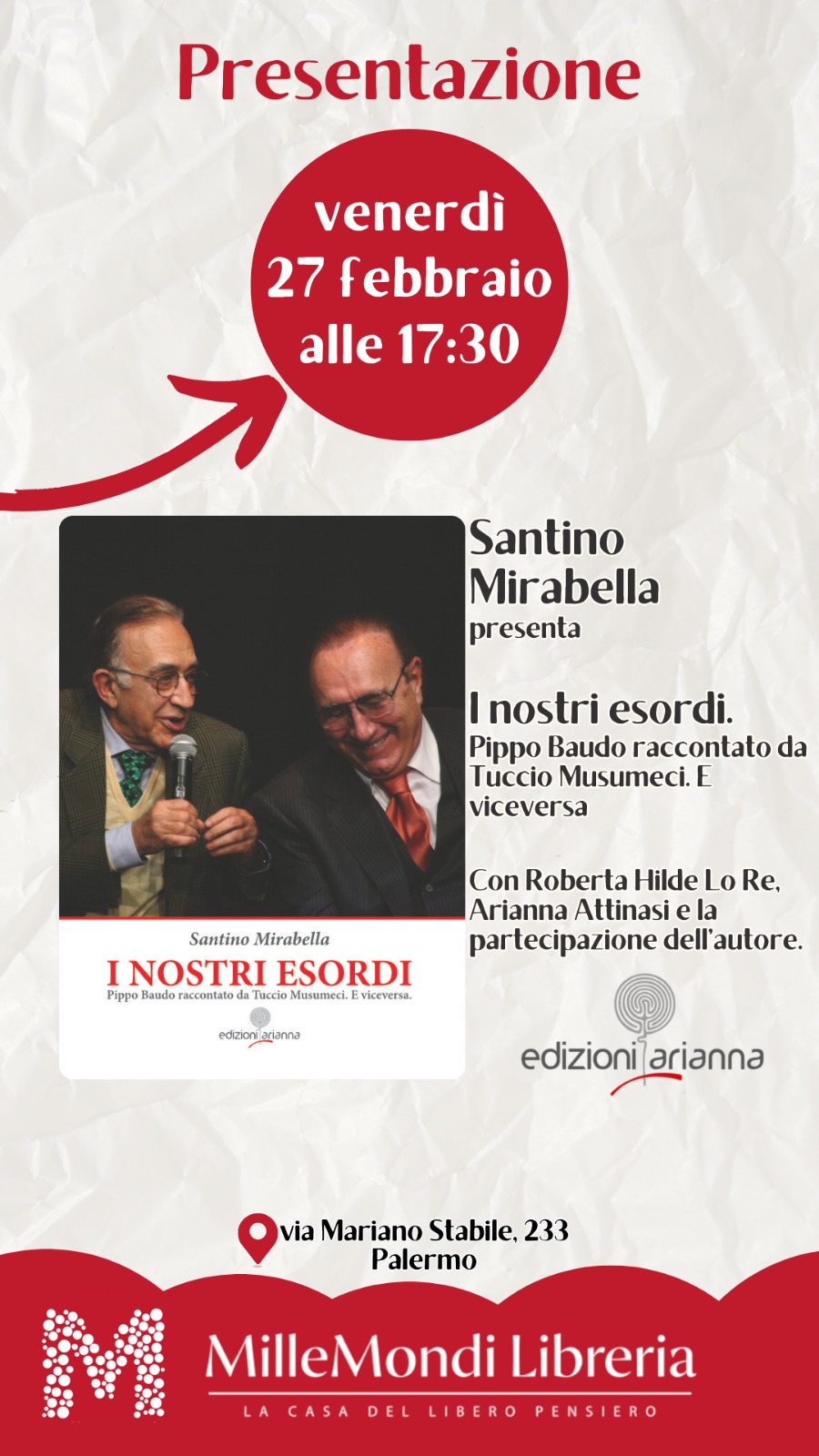 Alla libreria Millemondi il libro di Santino Mirabella Venerdì 27 febbraio 2026 h 17:30Via Mariano Stabile 233 Presenteranno il libro con l’Autore Arianna Attinasi e Roberta Hilde Lo Re Pippo e Tuccio. Tuccio e Pippo. Un’Amicizia forte, sincera, profonda, tenera e anche unica e divertente. Due Siciliani veri, autentici, innamorati di Catania e della Sicilia.Continue reading Storia della Rai. A Palermo gli esordi di Pippo Baudo.