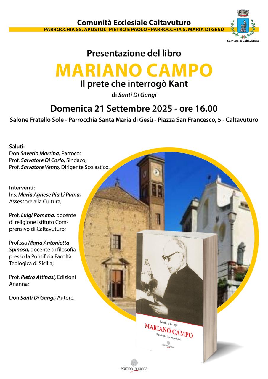 Mariano Campo prete-filosofo in odore di santità. Presentazione del libro di don Santi Di Gangi, Mariano Campo. Il prete che interrogò Kant. Mercoledì 5 novembre 2025 h 17:00SALA PADRE LORENZO MARZULLOVia Roma, 76 – Castelbuono. Con la partecipazione di S.E.R. Giuseppe Marciante, Vescovo della Diocesi di Cefalù. Interverranno:– il Sindaco Mario Cicero;– il Coordinatore delContinue reading Biblioteca Comunale Castelbuono →